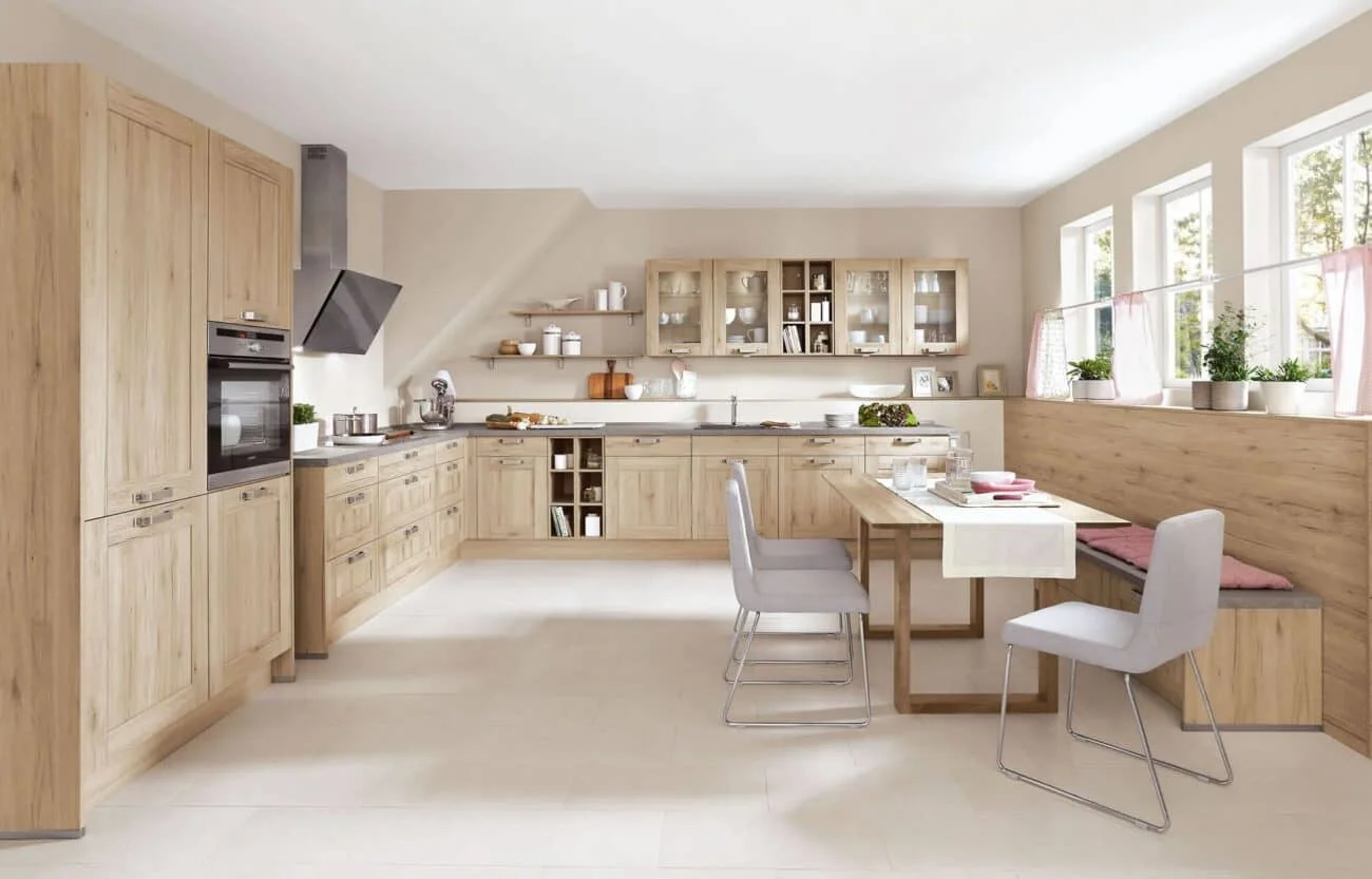 Los muebles de la cocina de estilo cásico moderno se caracterizan por ser de gran calidad y realizados de madera natural. Su equipamiento estará oculto dentro de los muebles, estando permitido instalar algún estante abierto para platos y utensilios. Mostrar preciosos platos originales dentro de gabinetes acristalados estará permitido dentro de este estilo. Las ventanas de la cocina lucirán perfectas con persianas de bambú o cortinas siempre de colores naturales, sin patrones ni pliegues. Para la iluminación artificial, los diseñadores de interiores recomiendan colocar candelabros o apliques, o incluso alguna lámpara de pie.